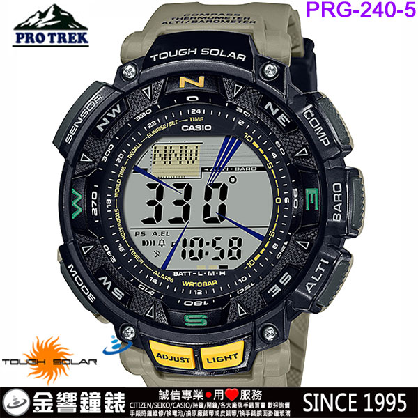 金響鐘錶精品購物網::專賣原廠公司貨:::歡迎議價或門市購買全年優惠 EST.1995 » CASIO系列 » PRO-TREK專業登山錶 » 【金響鐘錶】預購,CASIO PRG-240-5DR(公司貨,保固1年):::PRO TREK,太陽能專業登山錶,可旋轉錶圈,溫度,高度,氣壓,方位,PRG240 |