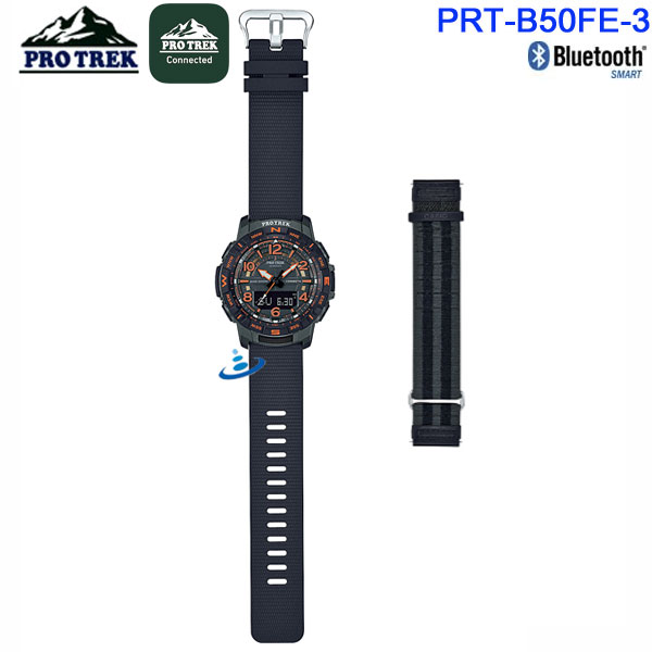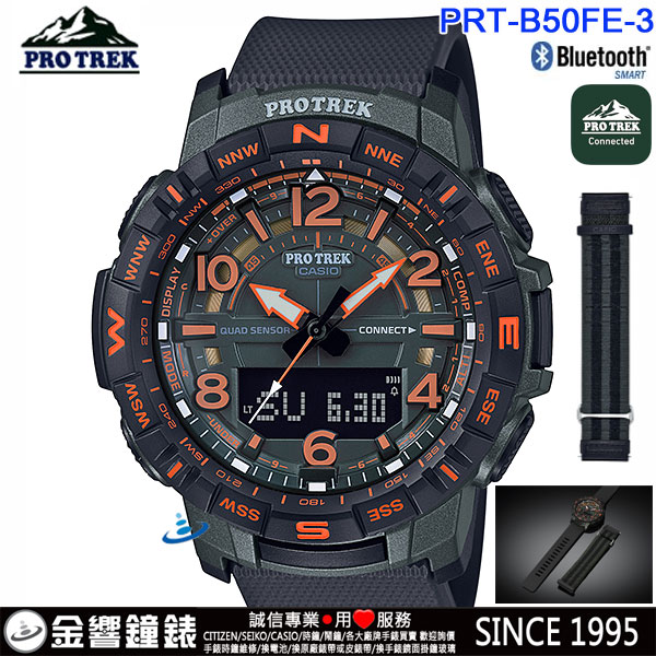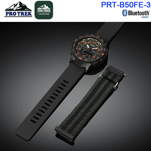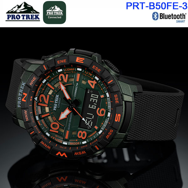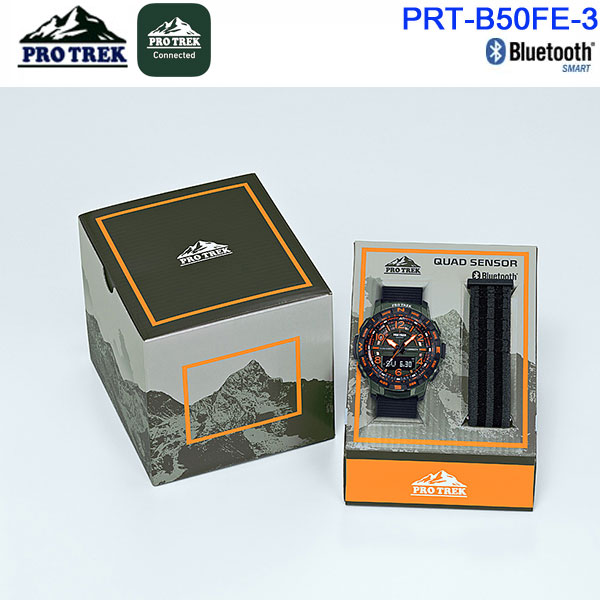 CASIO旗下登山腕錶品牌PRO TREK推出首款具備四重感應器與智慧藍牙連結功能的PRT-B50與PRT-B50FE,可測量方位、氣壓/高度、溫度和計算步數。除了感測自然環境的變化外,手錶可與專屬App連結,輕鬆掌握過往活動記錄,如:高度的上升與下降變化和步數數據計算消耗的卡路里數值。手錶亦可透過藍牙配對智慧型手機自動調整時間,並依據GPS定位獲取的高度數值自動校正手錶的測量數值。而任務日誌功能會根據手錶測量的高度數據與智慧型手機的GPS數據自動將路徑記錄到專屬App裡,並藉由定點紀錄功能紀錄當前位置並顯示在App裡,透過秒針顯示紀錄的終點位置,而在LCD螢幕顯示距離,幫助使用者在戶外探險的資訊所需。此外,為提供更友善的使用介面,使用者可以藉由App設定手錶各個功能模式之開關,亦或更改各個功能模式的切換順序。
