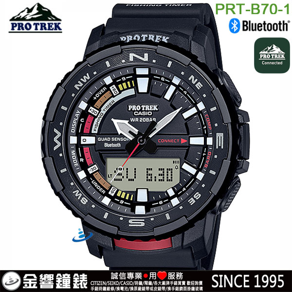 金響鐘錶精品購物網::專賣原廠公司貨:::歡迎議價或門市購買全年優惠 EST.1995 » CASIO系列 » PRO-TREK專業登山錶 » 【金響鐘錶】現貨,CASIO PRT-B70-1DR(公司貨,保固1年):::藍牙,PRO TREK,專業登山錶,指針數字雙顯,溫度,高度,氣壓,方位,釣魚時間,PRTB70 |