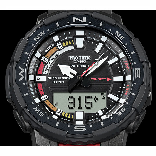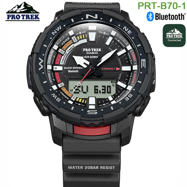 此外,PRT-B70搭載方位、高度/氣壓與溫度測量,並且搭載計步器。手錶還將來自智慧型手機的資訊用於位置指示器,顯示儲存在App的目的地間的方位與距離。該指示器顯示保存到App中目的地的方位和距離,即使在旅途中,也可以輕鬆地保持前進方向。亦可透過智慧型手機App連動手錶設定,同步手機時間至手錶,並可自訂不同螢幕上所顯示的資訊。