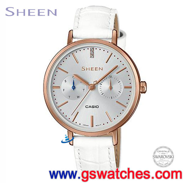 金響鐘錶精品購物網::專賣原廠公司貨:::歡迎議價或門市購買全年優惠 EST.1995 » CASIO系列 » Sheen 錶款 » 客訂商品,CASIO SHE-3054PGL-7AUDR(公司貨,保固1年):::Sheen,時尚女錶,多重指針,星期,日期,刷卡或3期零利率,SHE3054PGL |