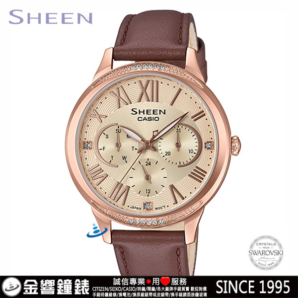 金響鐘錶精品購物網::專賣原廠公司貨:::歡迎議價或門市購買全年優惠 EST.1995 » CASIO系列 » Sheen 錶款 » 客訂商品,CASIO SHE-3058PGL-9AUDF(公司貨,保固1年):::Sheen,時尚女錶,星期日期,24小時指針,刷卡或3期零利率,SHE3058PGL |