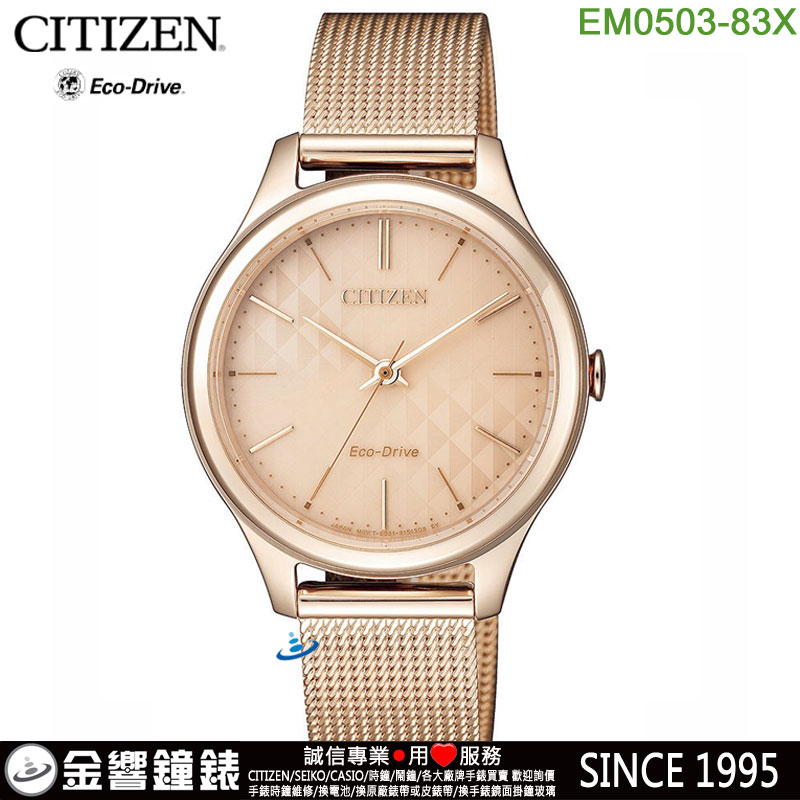金響鐘錶精品購物網::專賣原廠公司貨:::歡迎議價或門市購買全年優惠 EST.1995 » CITIZEN系列 » LADY'S 時尚女錶 » 【金響鐘錶】現貨,CITIZEN EM0503-83X(公司貨,保固2年):::Eco-Drive,光動能,時尚女錶,5氣壓防水,強化玻璃,E031機芯,EM050383X |