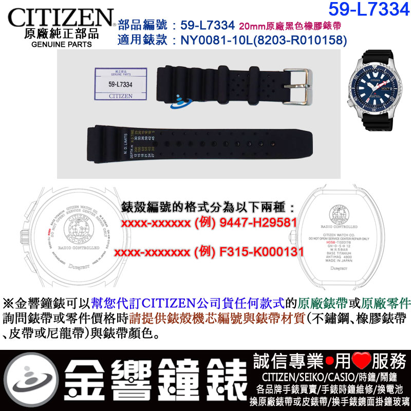 金響鐘錶精品購物網::專賣原廠公司貨:::歡迎議價或門市購買全年優惠 EST.1995 » 其他系列 » 錶帶WATCHBAND » CITIZEN原廠純正部品 » 【金響鐘錶】預購,CITIZEN 59-L7334(黑色橡膠錶帶-原廠純正部品):::NY0081-10L,8203-R010158,專用 |