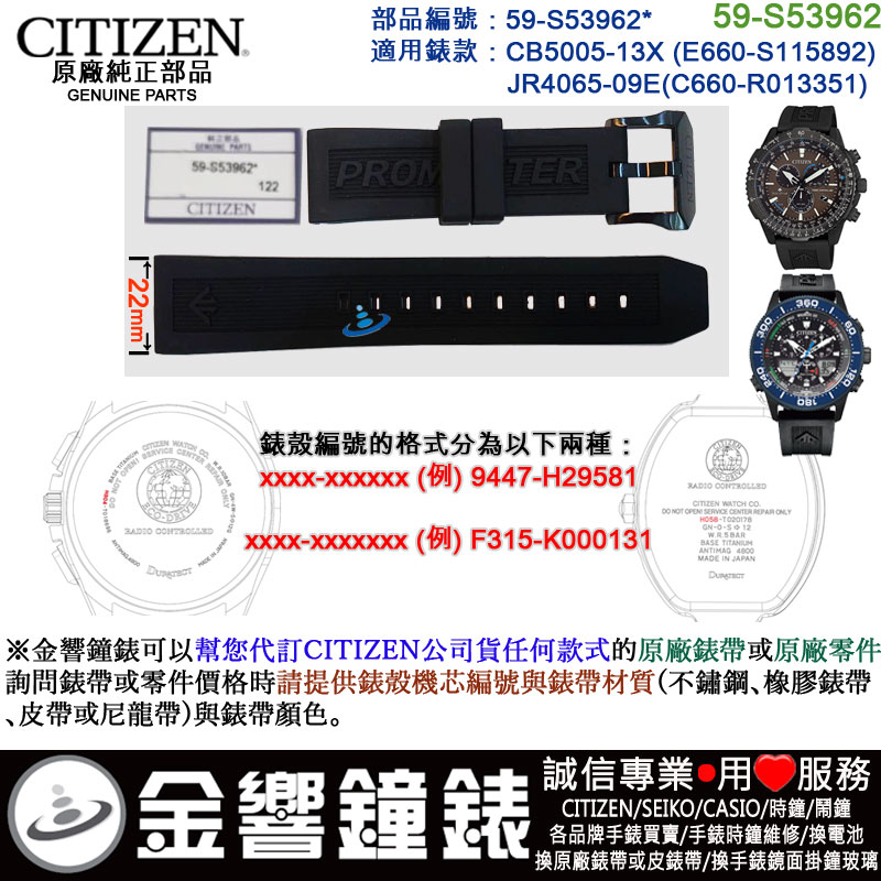 金響鐘錶精品購物網::專賣原廠公司貨:::歡迎議價或門市購買全年優惠 EST.1995 » 其他系列 » 錶帶WATCHBAND » CITIZEN原廠純正部品 » 【金響鐘錶】現貨,CITIZEN 59-S53962(橡膠錶帶-原廠純正部品):::CB5005-13X,E660-S115892,專用 |
