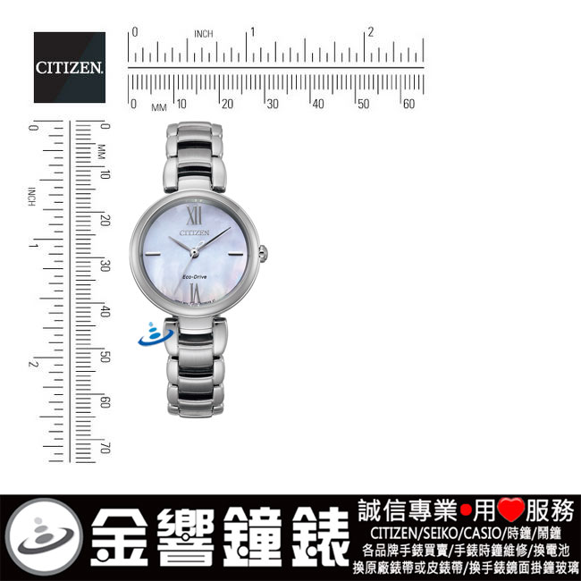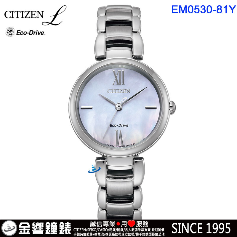 金響鐘錶精品購物網::專賣原廠公司貨:::歡迎議價或門市購買全年優惠 EST.1995 » CITIZEN系列 » L 錶款 » CITIZEN EM0530-81Y(公司貨,保固2年):::CITIZEN L,光動能,藍寶石鏡面,白蝶貝面板,聖誕節,刷卡或3期零利率,EM053081Y |