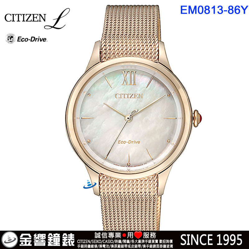 金響鐘錶精品購物網::專賣原廠公司貨:::歡迎議價或門市購買全年優惠 EST.1995 » CITIZEN系列 » L 錶款 » 【金響鐘錶】預購,CITIZEN EM0813-86Y(公司貨,保固2年):::CITIZEN L,光動能,藍寶石鏡面,白蝶貝面板,5氣壓防水,EM081386Y |