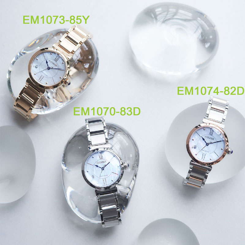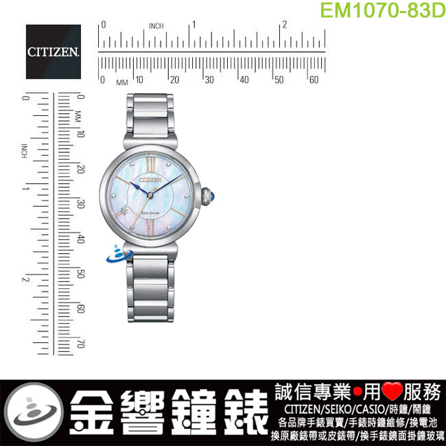 金響鐘錶精品購物網::專賣原廠公司貨:::歡迎議價或門市購買全年優惠 EST.1995 » CITIZEN系列 » L 錶款 » 【金響鐘錶】現貨,CITIZEN EM1070-83D(公司貨,保固2年):::CITIZEN L幸福鈴蘭,光動能,藍寶石鏡面,1顆鑽石,白蝶貝面板,時尚女錶,E031機芯,EM107083D |