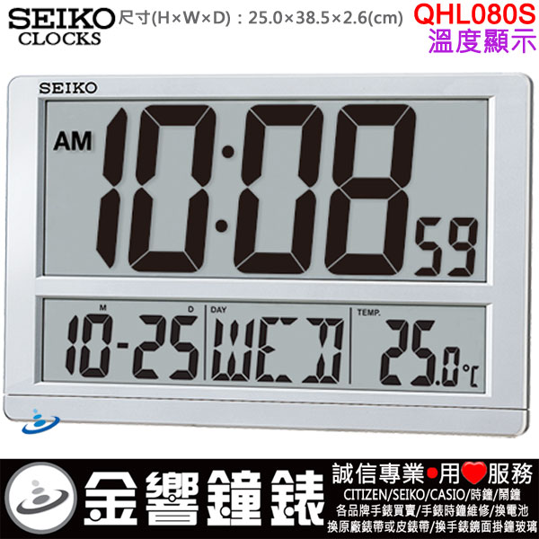 金響鐘錶精品購物網::專賣原廠公司貨:::歡迎議價或門市購買全年優惠 EST.1995 » 時鐘系列 » SEIKO 標準掛鐘 » SEIKO 數字型電子掛鐘 » 【金響鐘錶】現貨,SEIKO QHL080S(公司貨,保固1年):::SEIKO數位式座掛兩用掛鐘,日曆(月/日/星期),溫度,高25cm,寬38.5cm,時鐘,QHL-080S |