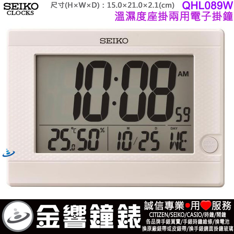金響鐘錶精品購物網::專賣原廠公司貨:::歡迎議價或門市購買全年優惠 EST.1995 » 時鐘系列 » SEIKO 標準掛鐘 » SEIKO 數字型電子掛鐘 » 【金響鐘錶】現貨,SEIKO QHL089W(公司貨,保固1年):::SEIKO數位式座掛兩用掛鐘,溫濕度,日曆(月/日/星期),高15cm,寬21cm,時鐘,QHL089W |