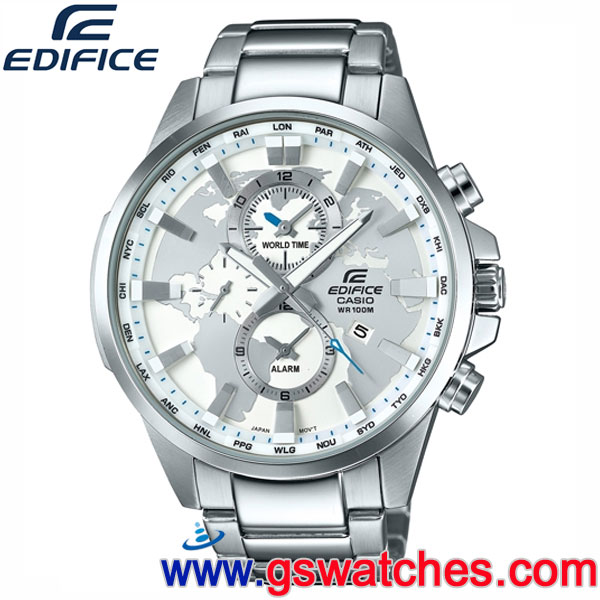 ●金響鐘錶販售之CASIO手錶皆為CASIO原廠代理之公司貨,附有原廠保證書(保固一年)與原廠錶盒及說明書。 EDFICE推出全新EFR-303系列,以簡潔的三針三眼設計顯示世界時間(時、分、秒)、鬧鈴時間,搭配世界地圖錶盤設計,外型俐落帥氣。EFR- 303D採用不銹鋼錶殼與錶帶,共推出2色錶盤-黑與白。EFR-303L則搭配黑色真皮錶帶及黑色IP處理錶圈,展現氣質仕紳風格。 ●原廠建議售價:NT$7,200 ●錶殼 / 錶圈材質:不鏽鋼