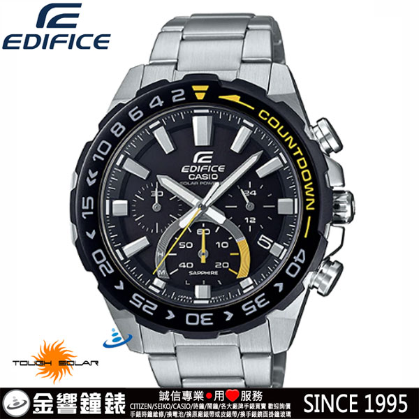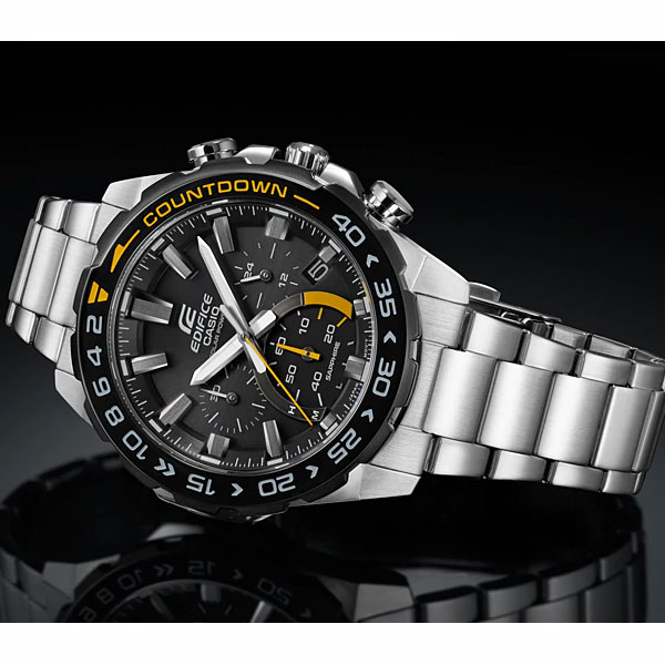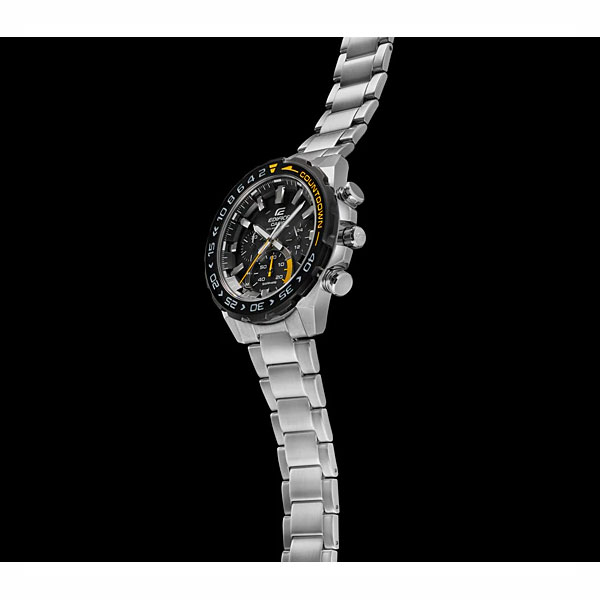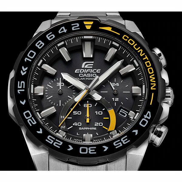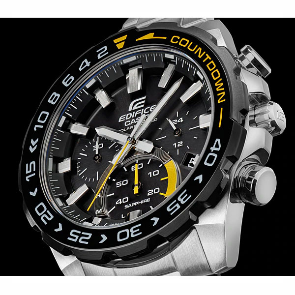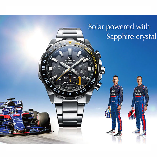 EDIFICE全新倒數計時錶圈系列新上市,EDIFICE身為一級方程式賽車隊SCUDERIA TORO ROSSO的官方指定合作夥伴,特別為賽事期間的維修人員量身設計突破性的倒數計時錶圈系列錶款,倒數計時錶圈有助於維修人員門管理工作時程,可統一倒數距離下一個工作的時間,抑或計算完成工作前的剩餘時間。 EFS-S550全系列搭載太陽能電力系統與高度防刮的藍寶石玻璃鏡面,並配備防水100米、計時碼錶、日期窗格和單向旋轉錶圈…等功能。分別以黃色和藍色點綴黑色離子IP電鍍處理的不鏽鋼錶圈,時尚與運動風格兼具,並提供金屬和樹脂錶帶兩種選擇。