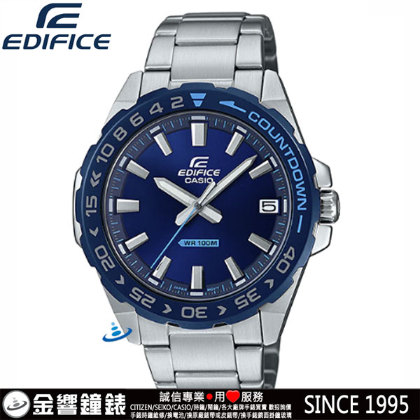 EFV-120DB系列錶款具備防水100米、日期窗格、金屬錶帶…等功能與設計,並提供錶圈分別經黑色和藍色IP離子電鍍處理的錶款。