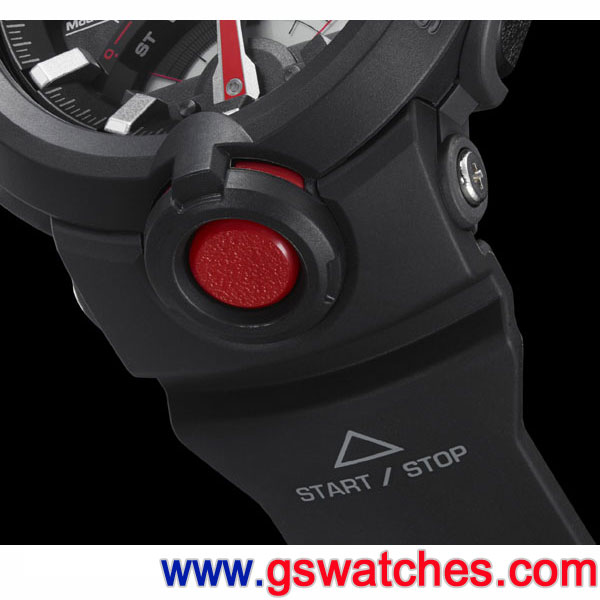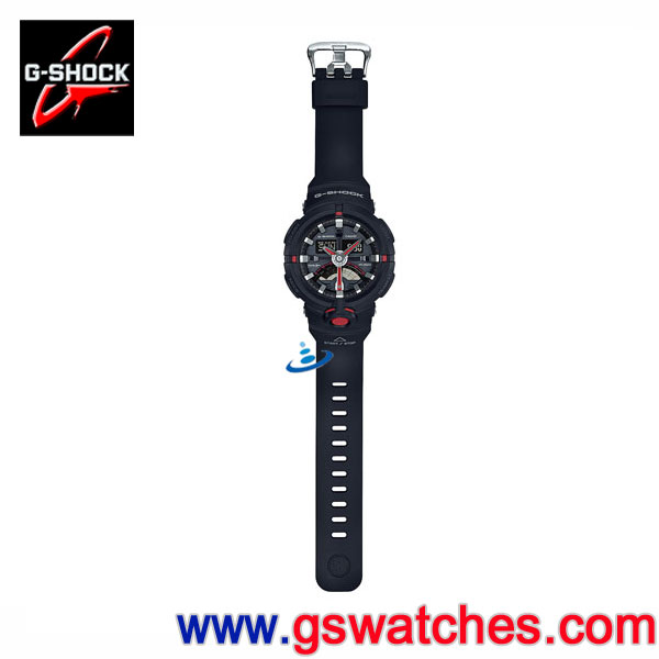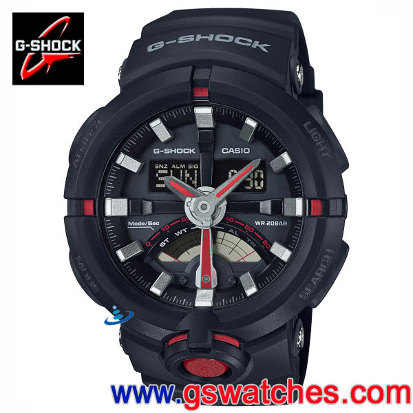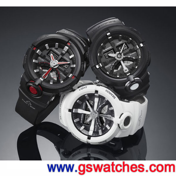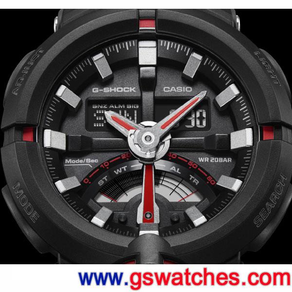 G-SHOCK全新設計GA-500系列,以城市運動為設計靈感,採用G-SHOCK全新樹脂成型技術,創造了獨特流線型外觀,全系列包含純黑、純白及黑紅三種色系選擇,前衛時尚的渾圓大錶殼設計及獨特十字分割錶盤,是以公路車齒輪改裝為設計概念,為手錶注入運動元素,3D多層次錶面搭載反轉液晶顯示和指針的雙顯功能,方便閱讀各項時間資訊,所有功能按鍵傾斜縮小的設計,以減少與手腕的接觸,增加使用舒適度,六點鐘方向的大型按,可快速啟動或停止碼錶功能,扇型錶眼為多功能逆跳指針和液晶顯示,並特別採用雙線圈馬達,讓錶眼的功能切換運作更為流暢,貼心的指針移動設計,當使用計時相關功能時,指針可手動避開液晶區域,讓使用者閱讀各種資訊時更加直覺與便利。除了G-SHOCK既有耐震、防水200米外,還搭載1/100秒計時碼錶、倒數計時器、世界時間,其中碼錶特別搭配目標時間的鬧鈴提醒功能。全新的GA-500整體外觀簡潔大方卻不失設計感,融合前衛時尚與運動風格,沉穩特質與速度感完整呈現。