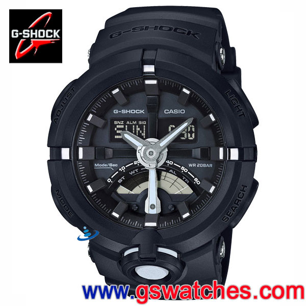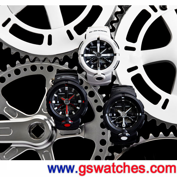G-SHOCK全新設計GA-500系列,以城市運動為設計靈感,採用G-SHOCK全新樹脂成型技術,創造了獨特流線型外觀,全系列包含純黑、純白及黑紅三種色系選擇,前衛時尚的渾圓大錶殼設計及獨特十字分割錶盤,是以公路車齒輪改裝為設計概念,為手錶注入運動元素,3D多層次錶面搭載反轉液晶顯示和指針的雙顯功能,方便閱讀各項時間資訊,所有功能按鍵傾斜縮小的設計,以減少與手腕的接觸,增加使用舒適度,六點鐘方向的大型按,可快速啟動或停止碼錶功能,扇型錶眼為多功能逆跳指針和液晶顯示,並特別採用雙線圈馬達,讓錶眼的功能切換運作更為流暢,貼心的指針移動設計,當使用計時相關功能時,指針可手動避開液晶區域,讓使用者閱讀各種資訊時更加直覺與便利。除了G-SHOCK既有耐震、防水200米外,還搭載1/100秒計時碼錶、倒數計時器、世界時間,其中碼錶特別搭配目標時間的鬧鈴提醒功能。全新的GA-500整體外觀簡潔大方卻不失設計感,融合前衛時尚與運動風格,沉穩特質與速度感完整呈現。
