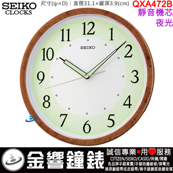 金響鐘錶精品購物網::專賣原廠公司貨:::歡迎議價或門市購買全年優惠 EST.1995 » 時鐘系列 » SEIKO 標準掛鐘 » SEIKO 標準掛鐘(滑動式秒針) » 【金響鐘錶】現貨,SEIKO QXA472B(公司貨,保固1年):::SEIKO 時尚掛鐘,夜光掛鐘,靜音機芯,直徑31.1cm,時鐘,QXA-472B |