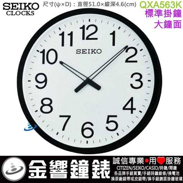 金響鐘錶精品購物網::專賣原廠公司貨:::歡迎議價或門市購買全年優惠 EST.1995 » 時鐘系列 » SEIKO 標準掛鐘 » SEIKO 標準掛鐘(滑動式秒針) » 【金響鐘錶】現貨,SEIKO QXA563K(公司貨,保固1年):::SEIKO 大鐘面掛鐘,直徑51cm,時鐘,QXA-563K |