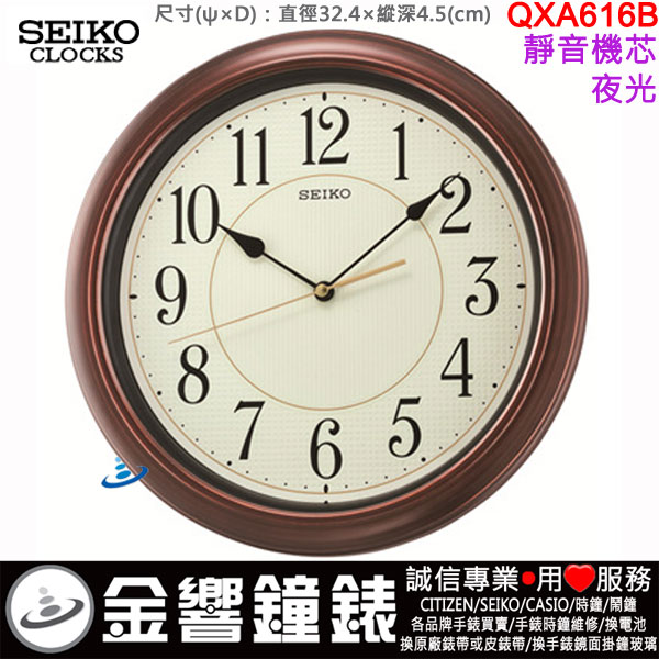 金響鐘錶精品購物網::專賣原廠公司貨:::歡迎議價或門市購買全年優惠 EST.1995 » 時鐘系列 » SEIKO 標準掛鐘 » SEIKO 標準掛鐘(滑動式秒針) » {金響鐘錶}現貨,SEIKO QXA616B(公司貨,保固1年):::SEIKO時尚掛鐘,靜音機芯,夜光顯示,塑膠外殼(仿木紋),直徑32.4cm,時鐘,QXA-616B |