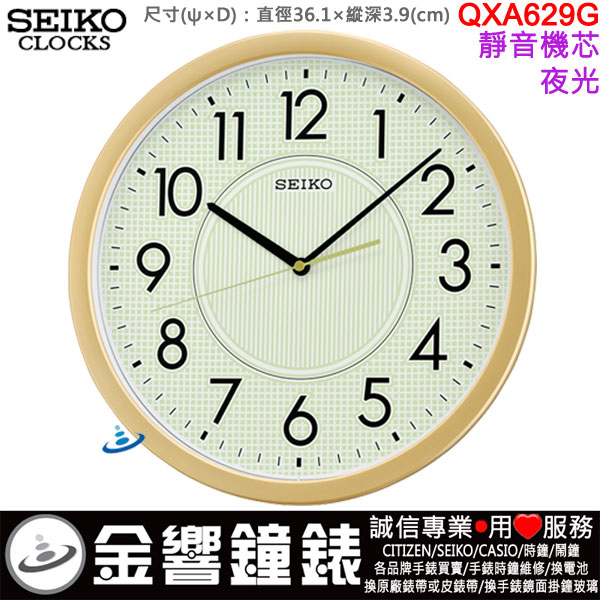 金響鐘錶精品購物網::專賣原廠公司貨:::歡迎議價或門市購買全年優惠 EST.1995 » 時鐘系列 » SEIKO 標準掛鐘 » SEIKO 標準掛鐘(滑動式秒針) » 【金響鐘錶】現貨,SEIKO QXA629G(公司貨,保固1年):::SEIKO 夜光掛鐘,靜音機芯,直徑36.1cm,時鐘,QXA-629G |