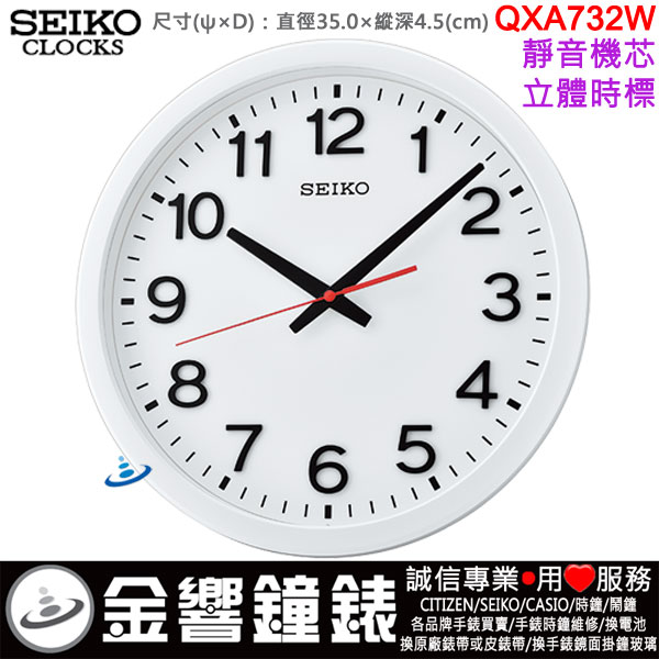 金響鐘錶精品購物網::專賣原廠公司貨:::歡迎議價或門市購買全年優惠 EST.1995 » 時鐘系列 » SEIKO 標準掛鐘 » SEIKO 標準掛鐘(滑動式秒針) » 【金響鐘錶】現貨,SEIKO QXA732W(公司貨,保固1年):::SEIKO,時尚掛鐘,立體時標,靜音機芯,直徑35cm,時鐘,QXA-732W |