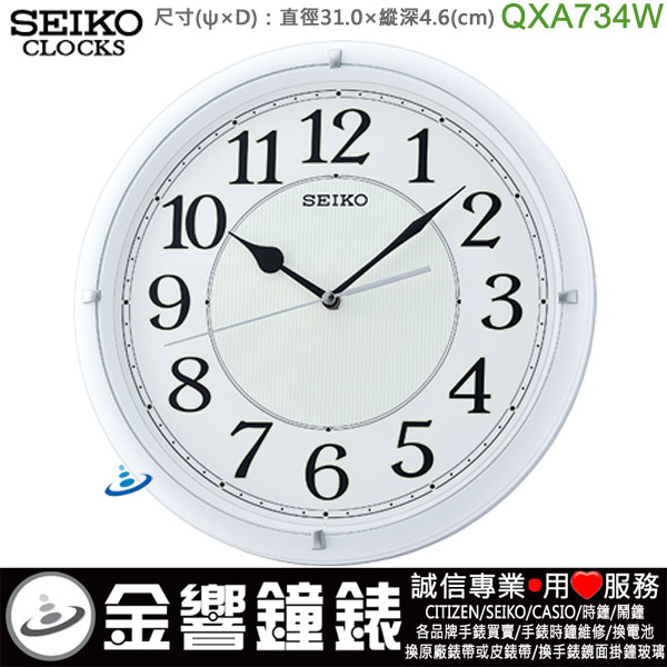 金響鐘錶精品購物網::專賣原廠公司貨:::歡迎議價或門市購買全年優惠 EST.1995 » 時鐘系列 » SEIKO 標準掛鐘 » SEIKO 標準掛鐘(滑動式秒針) » SEIKO QXA734W(公司貨,保固1年):::SEIKO,時尚掛鐘,夜光,滑動式秒針,直徑31.0cm,刷卡不加價,QXA-734W |