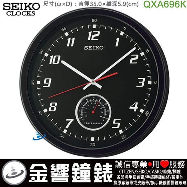 金響鐘錶精品購物網::專賣原廠公司貨:::歡迎議價或門市購買全年優惠 EST.1995 » 時鐘系列 » SEIKO 標準掛鐘 » SEIKO 標準掛鐘 » 【金響鐘錶】現貨,SEIKO QXA696K(公司貨,保固1年):::SEIKO 標準型掛鐘,時尚掛鐘,指針式溫度顯示,直徑35cm,時鐘,QXA-696K |