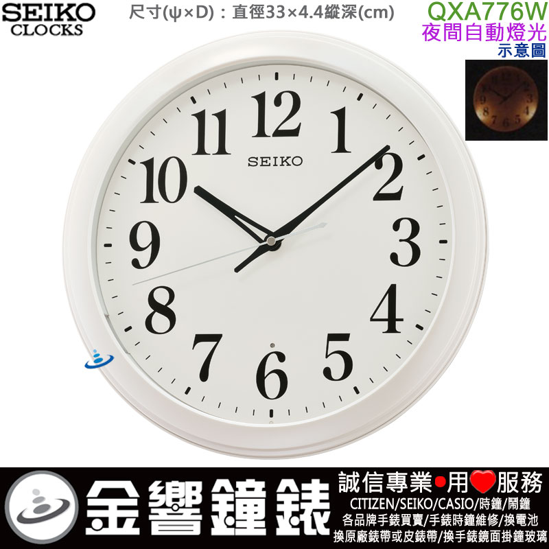 金響鐘錶精品購物網::專賣原廠公司貨:::歡迎議價或門市購買全年優惠 EST.1995 » 時鐘系列 » SEIKO 標準掛鐘 » SEIKO 標準掛鐘 » 【金響鐘錶】現貨,SEIKO QXA776W(公司貨,保固1年):::SEIKO,時尚掛鐘,夜間自動燈光,直徑33cm,時鐘,刷卡不加價,QXA-776W |