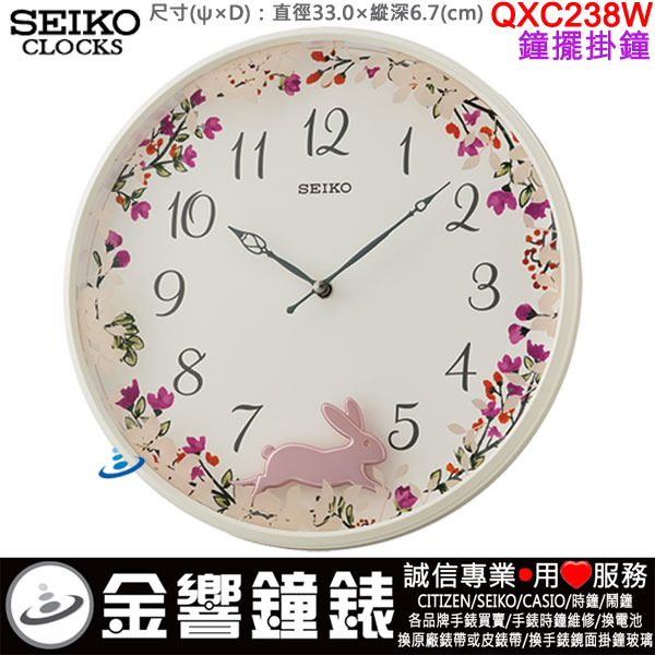 金響鐘錶精品購物網::專賣原廠公司貨:::歡迎議價或門市購買全年優惠 EST.1995 » 時鐘系列 » SEIKO 標準掛鐘 » SEIKO 標準掛鐘 » 【金響鐘錶】現貨,SEIKO QXC238W(公司貨,保固1年):::SEIKO 時尚掛鐘,搖動擺飾,直徑33cm,時鐘,QXC-238W |