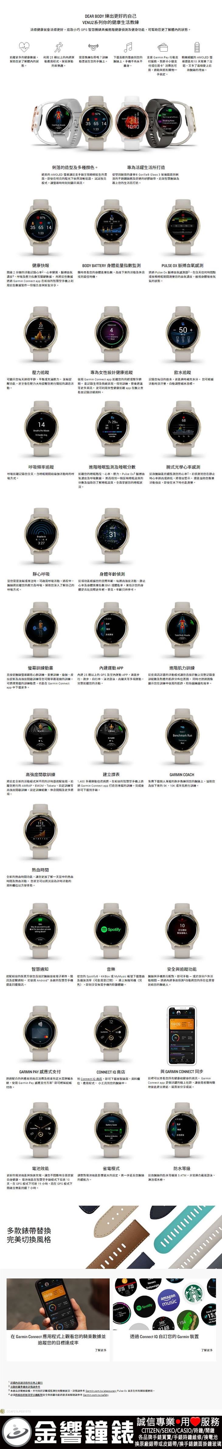 ![]() 標準配備:Venu 2、USB資料傳輸充電線、中文操作手冊、台灣Garmin沒有附保證書(保固條件為消費者購買Garmin商品後自行到台灣Garmin官網註冊日開始保固一年)。 |