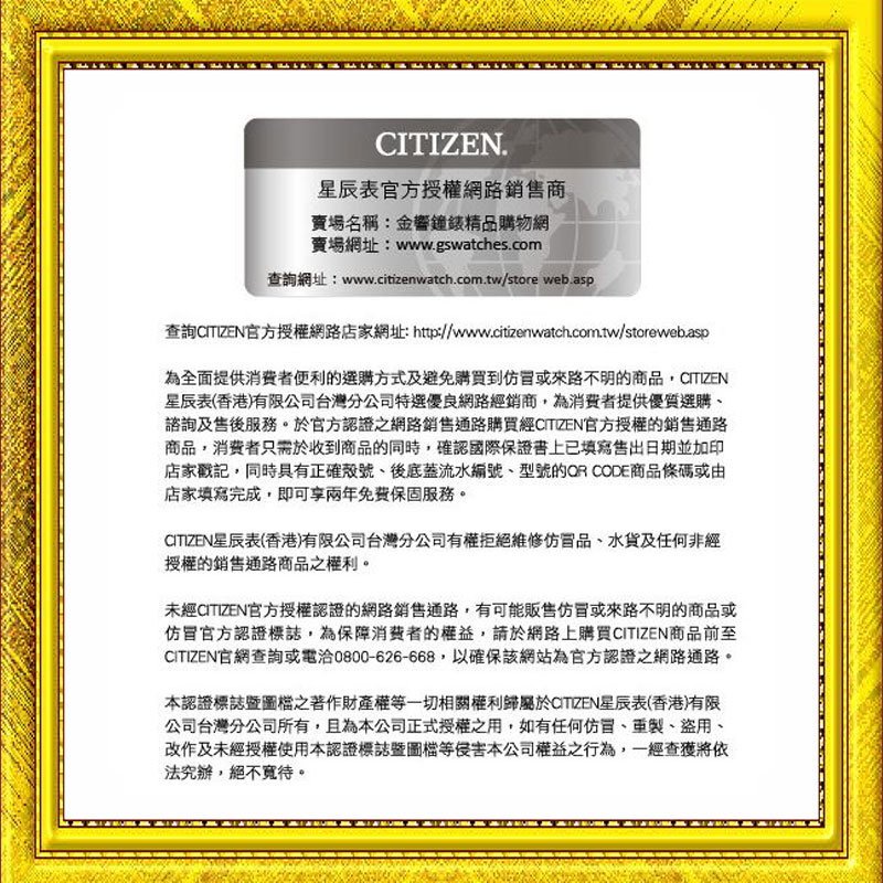 ●金響鐘錶販售之CITIZEN星辰錶皆為星辰錶公司(日本CITIZEN台灣分公司),代理之原廠公司貨,附有原廠保證書(保固二年(2011年10月1日全系列星辰錶開始實施台灣二年保固 / 國外保固一年政策))與原廠錶盒及說明書。 ●藍寶石玻璃鏡面 尺寸(W×H):33.4×37.7(mm)